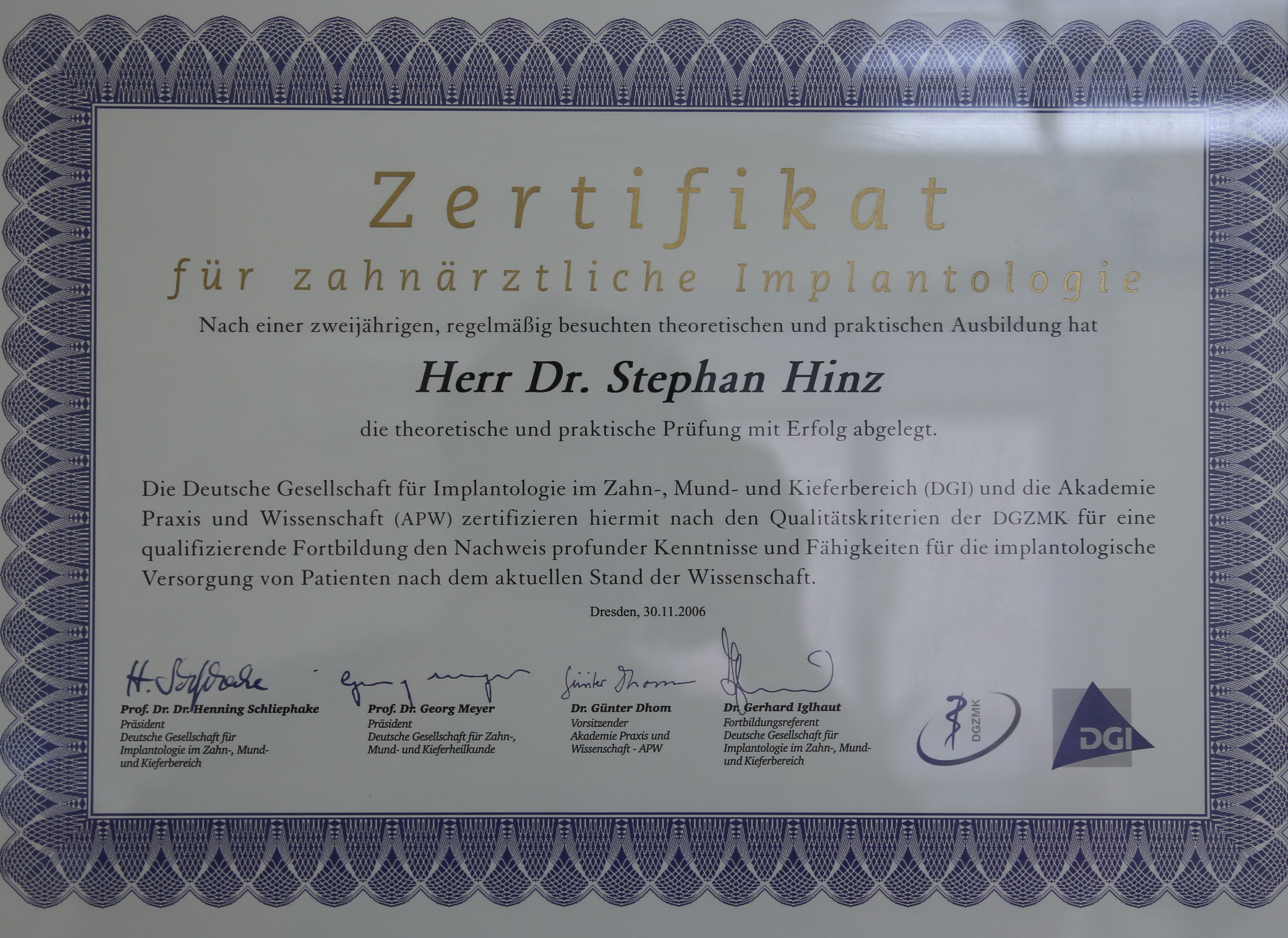 - Zertifizierter Tätigkeitsschwerpunkt Implantologie (DGI) seit 2006