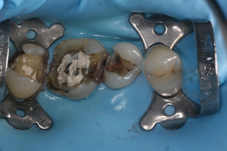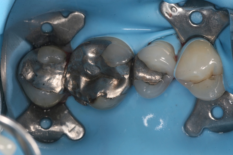 - Eine undurchlässige Folie(Kofferdamm) wird vor der Amalgamentfernung